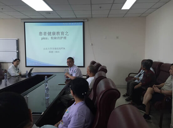 本次講座,李杰博士和靳護(hù)士長首先介紹了齊魯醫(yī)院血液腫瘤病區(qū)的專病特色“淋巴腫瘤”,以及淋巴瘤MDT團(tuán)隊(duì),強(qiáng)調(diào)初診患者常態(tài)化多學(xué)科會診,即由病理、影像、放療、化療等多學(xué)科醫(yī)師共同討論病情制定診療方案;并簡要介紹了近年來血液腫瘤病區(qū)在“國際遠(yuǎn)程交流與會診”、“患者登記及隨訪管理”、“老年綜合評估與個體化治療”等項(xiàng)目的開展,以及通過齊魯醫(yī)院國際遠(yuǎn)程會診平臺所開展的腫瘤疑難病例中美會診和線上學(xué)術(shù)交流等新型診療模式;隨后便圍繞核心主題“PICC、粒缺的護(hù)理”展開了一個多小時的詳細(xì)解說,以及醫(yī)患間的互動式討論。