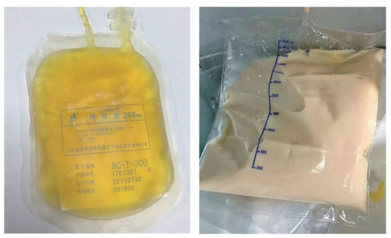 正常人血漿是透明的淡黃色(如左圖),右邊那張,是個(gè)27歲姑娘的血漿……