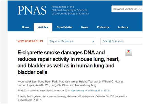 1、E-cigarette smoke damages DNA and reduces repair activity in mouse lung, heart, and bladder as well as in human lung and bladder cells.