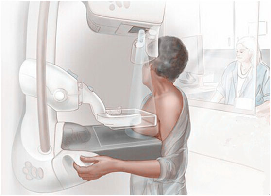 圖示:接受乳房x光檢查的人把乳房放在兩個(gè)透明板之間,兩個(gè)板會擠壓乳房,讓乳房保持在合適的位置。這會使乳房變平以獲得更好的圖像,并防止圖像模糊。檢查大約需要20分鐘。有些人可能會感到輕微的疼痛或不適。