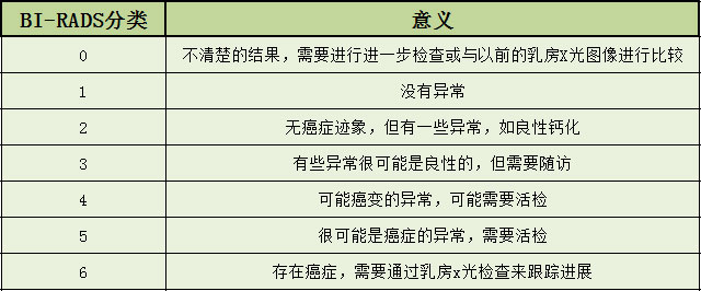 臨床上,醫(yī)生使用乳房成像報(bào)告和數(shù)據(jù)系統(tǒng)(BI-RADS)來報(bào)告乳房X光檢查的結(jié)果。BI-RADS使用數(shù)字0到6的分類,來代表不同的檢查結(jié)果。