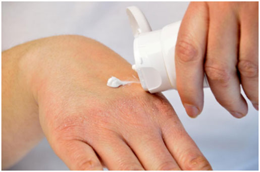 ·在干燥的手背皮膚上涂抹潤(rùn)膚霜;