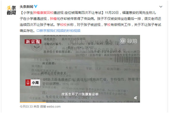 近日,福建惠安的周先生稱兒子在小學(xué)遭遇歧視,腫瘤化療卻被傳言得了傳染病。孩子不僅被安排坐在最后一排,語文老師還連續(xù)四次不讓孩子考試。