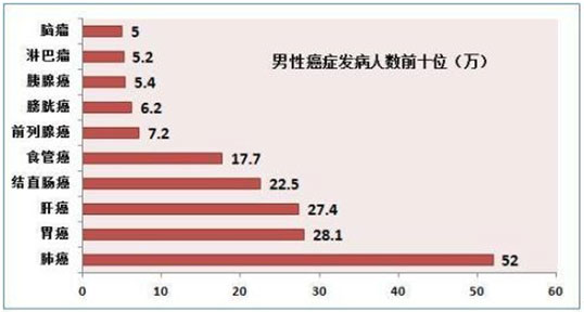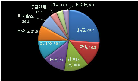 從發(fā)病人數(shù)看,肺癌位居我國惡性腫瘤發(fā)病首位,發(fā)病人數(shù)為78.4萬。第二至第十分別為胃癌、結(jié)直腸癌、肝癌、乳腺癌、食管癌、甲狀腺癌、子宮頸癌、腦癌、胰腺癌。前10位惡性腫瘤發(fā)病約占全部惡性腫瘤發(fā)病的76.70%。