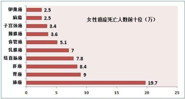 男性和女性的惡性腫瘤死因順位略有差異。男性依次為肺癌、肝癌、胃癌、食管癌和結(jié)直腸癌等;女性主要惡性腫瘤死因順位依次為肺癌、胃癌、肝癌、結(jié)直腸癌和乳腺癌。