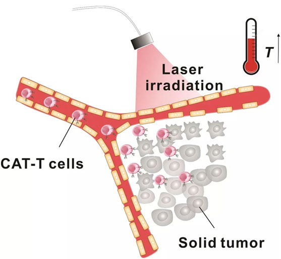 研究小組在注射了人類黑色素瘤腫瘤的老鼠身上測(cè)試了這項(xiàng)技術(shù)。他們將光熱劑注入腫瘤,然后用激光加熱。把激光的溫度提高到40℃有助于擴(kuò)張支持腫瘤生長(zhǎng)的血管,從而增強(qiáng)T細(xì)胞進(jìn)入腫瘤的能力。最終通過(guò)靜脈注射CAR-T細(xì)胞。