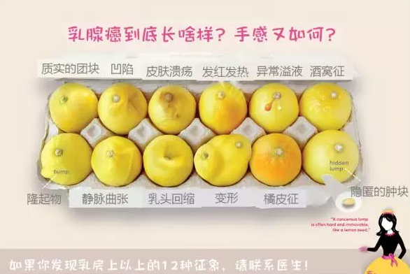 她用12個(gè)檸檬描述乳腺癌的12種不同形態(tài):厚塊、皮膚壓痕、皮膚疼痛、發(fā)紅發(fā)熱、乳頭溢液、皮膚凹陷、皮膚隆起、新出現(xiàn)靜脈、乳頭回縮、乳房出現(xiàn)新形狀/大小、橘皮樣皮膚、隱性腫塊(癌性腫塊像檸檬籽一樣堅(jiān)硬、難以移動(dòng))。