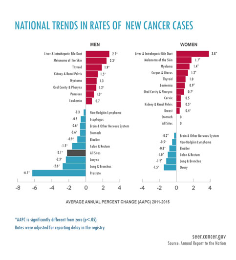 ● 總的來說,女性癌癥發(fā)病率呈穩(wěn)定趨勢,男性每年下降2.1%。