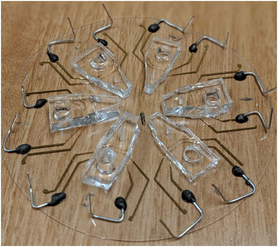 圖示:六個帶有生物傳感器的設備,安裝在一塊3英寸寬的玻璃上。當癌細胞通過一個微小的流體孔時,該設備可以檢測癌細胞是否存活。