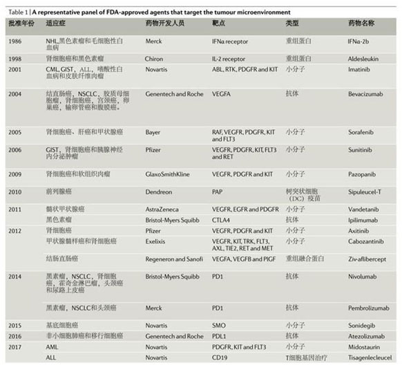 目前,美國(guó)FDA也已針對(duì)腫瘤微環(huán)境的不同因素,批準(zhǔn)了相應(yīng)的藥物(如下圖所示):