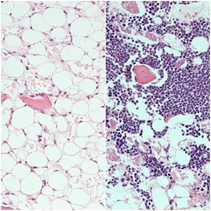 輻射過后,小鼠骨髓中幾乎完全喪失了血細胞(左)。用PTP-sigma抑制劑治療的小鼠顯示血細胞快速恢復(紫色,右側)