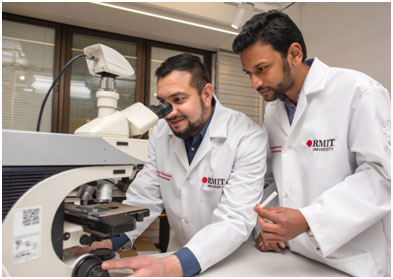 圖示: Taimur Ahmed博士和Ganganath Perera博士研究來自RMIT大學(xué)開發(fā)的納米技術(shù)傳感器的樣本。資料來源:Adam R. Thomas