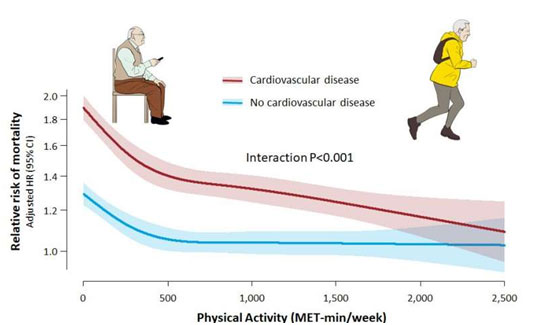 在6年的隨訪期間內(nèi),研究人員發(fā)現(xiàn),增加體育活動可以降低死亡風(fēng)險。但風(fēng)險降幅最大的是那些患有心血管疾病的人,并且隨著運動量加大,死亡風(fēng)險持續(xù)降低。