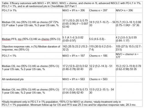 與化療相比,納武利尤單抗加伊匹木單抗的總生存期明顯延長(zhǎng):在PD-L1>1%的患者中中位總生存期為17.9個(gè)月,化療組為14.9個(gè)月。無(wú)進(jìn)展生存率、客觀緩解率和緩解時(shí)間均高于化療。 PD-L1<1%的患者中和化療相比,總生存率也有明顯的改善。
