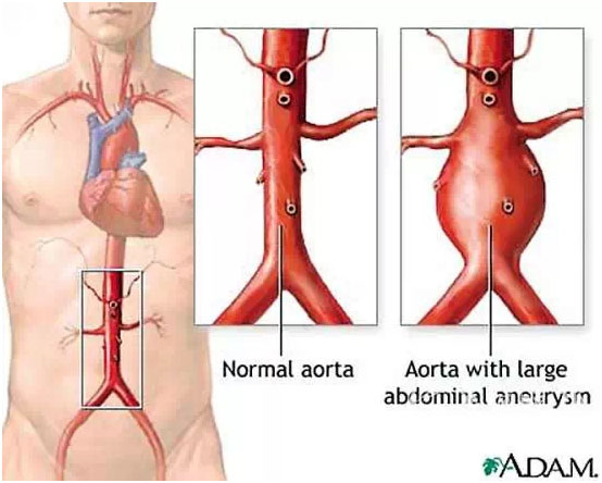 動脈瘤可以發(fā)生在主動脈的任何部分,最常見于腹部(腹主動脈瘤),也可發(fā)生于上半身(胸主動脈瘤)。主動脈瘤過度擴張或太脆弱,就很容易破裂,導致嚴重出血,迅速致死。