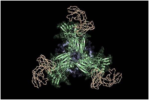 科學(xué)家們?cè)O(shè)計(jì)和測(cè)試一種新疫苗候選體(綠色和藍(lán)色) 能與艾滋病病毒前體廣泛中和抗體(tan)結(jié)合,有望作為艾滋病病毒疫苗的第一階段。(來(lái)源:斯克里普斯研究所Schief實(shí)驗(yàn)室)