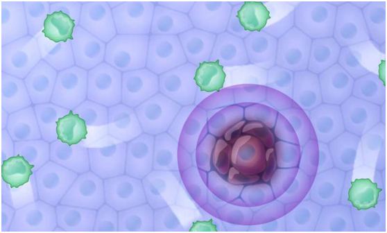 圖示:癌細胞躲過人體的免疫反應(yīng),不受T細胞(綠色)的阻礙,它們可以繼續(xù)復制。