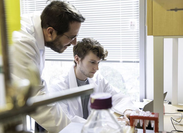 圖示:分子生物科學副教授杰森·麥克萊倫(左)和研究生丹尼爾·拉普。(圖片來源:Vivian Abagiu/UT Austin)