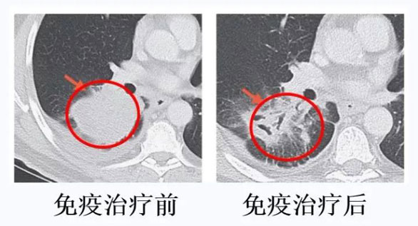 免疫治療則是通過激活免疫細(xì)胞的方式“剿滅”癌細(xì)胞,腫瘤細(xì)胞被增多的免疫細(xì)胞所替代。光看CT的話,“腫瘤”可能不僅沒縮小,可能還會變大,產(chǎn)生一種疾病發(fā)生“進(jìn)展”的錯覺。