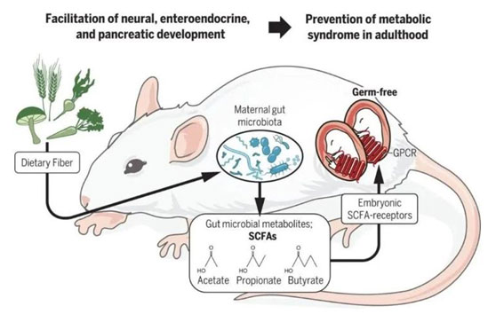生活在正常環(huán)境中的懷孕母鼠,如果飲食中膳食纖維含量特別低,生下的小鼠也容易出現(xiàn)代謝問題,與在無菌環(huán)境下的情況類似;如果在低纖維情況下給母鼠補充一些丙酸鹽,則可以起到補救作用。