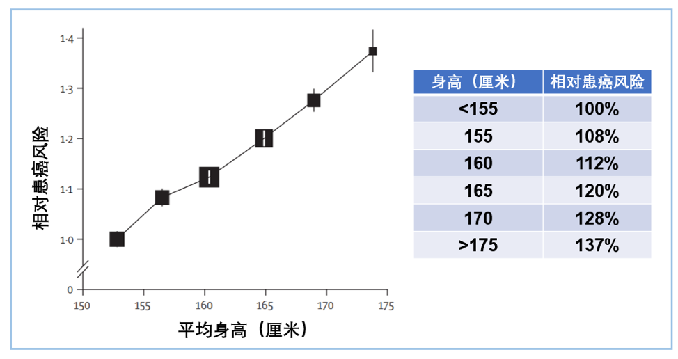 2011年,《柳葉刀·腫瘤學(xué)》上發(fā)表了英國著名的“百萬女性研究項(xiàng)目”結(jié)果。通過對英國一百多萬女性,平均10年的跟蹤研究,科學(xué)家發(fā)現(xiàn)身高增長和患癌風(fēng)險簡直是線性關(guān)系。