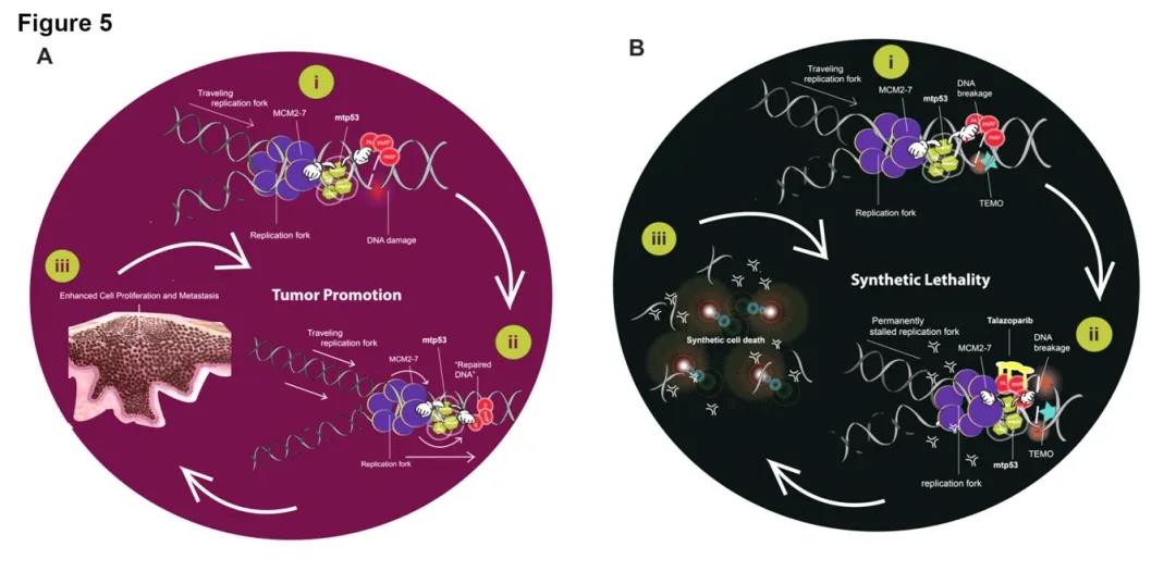 上圖顯示了MTP53 R273H、PARP和MCM2-7蛋白在復(fù)制DNA上的協(xié)同如何在腫瘤發(fā)展中發(fā)揮作用。在左圖中,MCM2-7(以紫色顯示),MTP53 R273H(以綠色顯示)和PARP(以紅色顯示)與復(fù)制的DNA相互作用。當(dāng)發(fā)生細(xì)胞損傷時(shí),它們有助于促進(jìn)異常修復(fù),使細(xì)胞存活并促進(jìn)腫瘤發(fā)展。在右圖中,高表達(dá)PARP和MTP53的細(xì)胞用他唑帕尼(以黃色顯示)與替莫唑胺組合處理,這使PARP可被捕獲在復(fù)制的染色質(zhì)上。這增加了DNA損傷的失修,促進(jìn)了細(xì)胞死亡并阻止了腫瘤的發(fā)展。