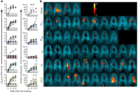研究者表示,接受卡介疫苗靜脈注射的10只獼猴中有9只得到了更有效的保護(hù),通過影像分析分枝桿菌生長、病理學(xué)和肉芽腫的形成,6只猴子未檢測到感染。