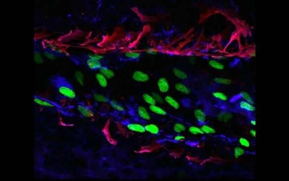 圖示:腫瘤血管的高倍圖像,內(nèi)皮細(xì)胞顯示為藍(lán)色。它們的細(xì)胞核呈綠色,提示高S1P受體信號(hào),這有助于確保腫瘤的良好血液循環(huán)。血管平滑肌細(xì)胞呈洋紅色。