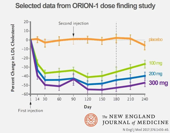 在ORION-10和ORION-11試驗中,參與者的他汀類藥物使用率較高,分別為89%和95%,且大部分患者接受過高強度他汀類藥物治療,分別為68%和78%。接受試驗前,患者的膽固醇平均值分別為2.71 mmol/L和2.73 mmol/L。