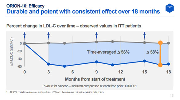 第510天時,與安慰劑相比,ORION-10試驗組的LDL-C水平降低了52.3%,ORION-11試驗組則降低了49.9%。