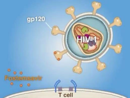 Fostemsavir作用于病毒感染的第二個(gè)階段,通過抑制HIV病毒表面包膜蛋白gp120與T細(xì)胞表面的CD4受體結(jié)合,使得病毒粒子無法入侵到細(xì)胞內(nèi),進(jìn)而達(dá)到抗病毒的作用。