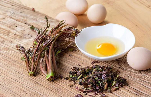 2. 在烹飪前,用沸水焯燙約1分鐘,減少亞硝酸鹽和硝酸鹽,同時(shí)更好地保持香椿的綠色;