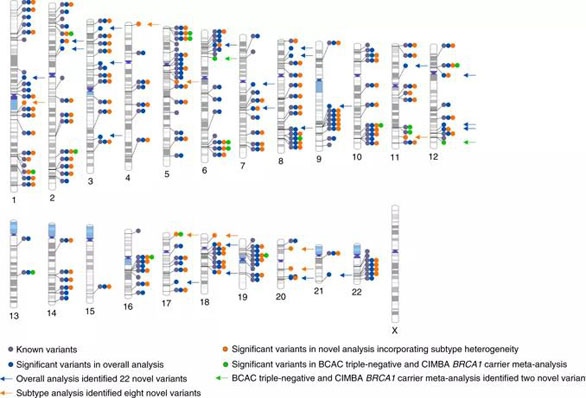 因為乳腺癌易感性變異通常在腫瘤亞型的關聯(lián)中表現(xiàn)出異質性。所以,為了確定新的基因位點,研究人員進行了全基因組的關聯(lián)研究,包含超過13萬例乳腺癌病例和11萬多人的對照,以及近2萬例BRCA1突變攜帶者(9414例乳腺癌患者)。