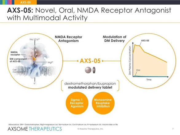 AXS-05是一種新型的口服、非競(jìng)爭(zhēng)性NMDA受體拮抗劑,與其他神經(jīng)遞質(zhì)系統(tǒng)(sigma-1、血清素、去甲腎上腺素、多巴胺)的活性相關(guān),可用于阿爾茨海默病相關(guān)躁動(dòng)癥、重度抑郁癥和其他中樞神經(jīng)系統(tǒng)(CNS)疾病的治療。