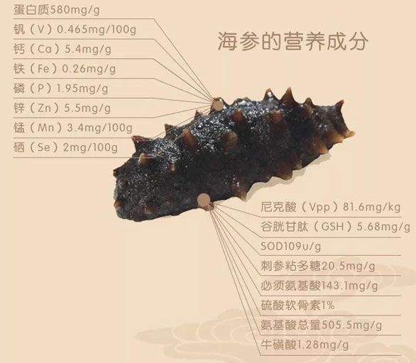 海參體內(nèi)有珍貴的海參皂苷,能對(duì)抗組織細(xì)胞氧化,調(diào)節(jié)免疫作用和協(xié)同菌苗的免疫活性,有助于縮小、消除腫瘤,達(dá)到抗癌防癌的目的。