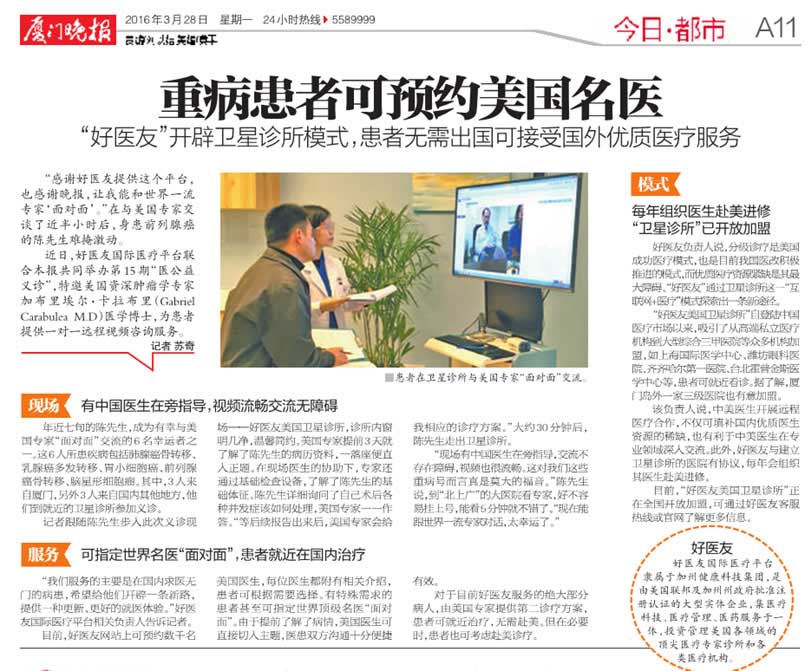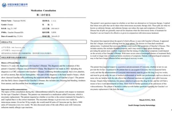 在確診4年后,未經任何治療的吳女士病情日益惡化,2016年3月復查腹部彩超提示脾臟重度腫大,伴肝臟體積增大,這種情況除了采取“脾臟切除術”,在國內似乎沒有其他選擇了,然而這種手術是把“雙刃劍”,雖然有助于減輕貧血和出血傾向,但也有加速肝大及骨骼破壞的可能。躊躇之際,廈門晚報的一篇文章,引起了吳女士的關注,這是一篇題為《重病患者可預約美國名醫(yī)——“好醫(yī)友”開辟衛(wèi)星診所模式,患者無需出國可接受國外優(yōu)質醫(yī)療服務》的專題報道,從中吳女士意識到她還可以尋求美國醫(yī)生的治療建議。