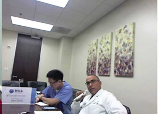 W女士在現(xiàn)場(chǎng)醫(yī)生陪同下與Afshin Eli Gabayan M.D.醫(yī)生進(jìn)行遠(yuǎn)程視頻會(huì)診