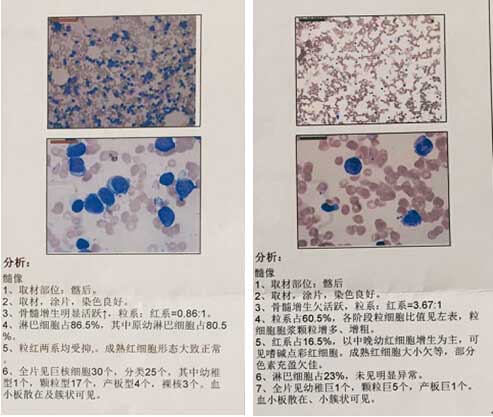 圖左:新方案治療前骨髓增生明顯活躍,粒系:紅系=0.86:1 圖右:新方案治療2周后骨髓增生欠活躍,粒系:紅系=3.67:1