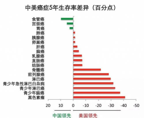 根據(jù)權威醫(yī)學期刊《柳葉刀》2000-2014年全球癌癥生存狀況的監(jiān)測數(shù)據(jù)顯示,在肺癌、胰腺癌、黑色素瘤等15種癌癥方面,中國明顯落后美國。其中黑色素瘤上差距最大,中國落后了43個百分點。近幾年,美國靶向治療、免疫治療等新療法越來越普及,中美間癌癥五年生存率的總體差距只會更大。