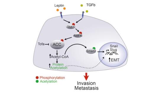 因?yàn)榉逝?,血液中由免疫?xì)胞分泌的特定細(xì)胞因子——瘦素、轉(zhuǎn)化生長因子-β(TGF-β)濃度會上調(diào),從而抑制乙酰輔酶A羧化酶(ACC1)的活性。這一抑制會導(dǎo)致脂肪酸前體——乙酰輔酶A(acetyl-CoA)累積,進(jìn)一步改變調(diào)節(jié)基因表達(dá)的蛋白,最終促成乳腺癌的轉(zhuǎn)移。