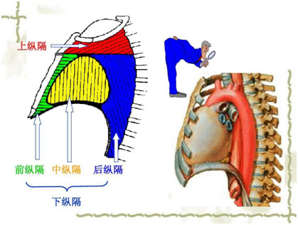 臨床上按照“解剖四分法”可將縱隔分為上縱隔和下縱隔,下縱隔又以心包為界分為前、中、后三個(gè)方面。