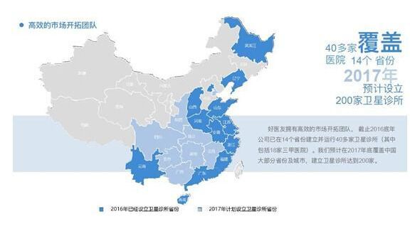 其二就是對中國三甲醫(yī)院資源的整合。該集團已與國內(nèi)眾多知名、頂尖醫(yī)療機構(gòu)合作,診所網(wǎng)點已順利入駐華北地區(qū)、華東地區(qū)、華南地區(qū)的40多家醫(yī)院,均為省級及地市級龍頭。