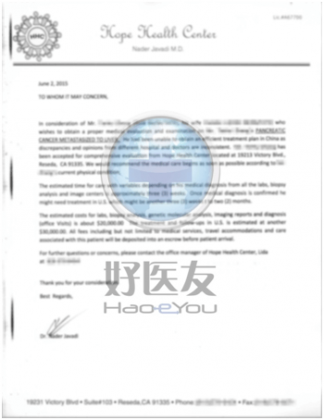 沒想到的是,6月4日晚上,好醫(yī)友就已經(jīng)幫我提交了加急面簽的申請。僅一天時間,他們就幫我搞定了所有材料,這種效率和速度,完全在我意料之外。因?yàn)?,申請加急面簽,除了需要國?nèi)醫(yī)生出具的“建議赴美就醫(yī)”陳述函,更為關(guān)鍵的是,要有美國醫(yī)生、醫(yī)院出具的證明信,證明我已做好治療準(zhǔn)備并標(biāo)明大致醫(yī)療費(fèi)用等。在美國這個凡事都要預(yù)約的國度,要在一天之內(nèi),聯(lián)系上醫(yī)生,獲取這些資料,基本不可能,但4號當(dāng)日,好醫(yī)友就拿到了由Dr Javadi診所提供的、醫(yī)生簽名的包含了我病情詳細(xì)說明和費(fèi)用預(yù)算的加急邀請函,我不得不感嘆好醫(yī)友的實(shí)力。