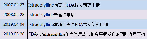 Istradefylline是一種選擇性腺苷A2A受體拮抗劑。早在2007年,該藥便已向美國FDA遞交了新藥上市申請,但未獲得批準。經(jīng)過12年的蟄伏,終于獲批。