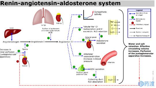 腎素-血管緊張素系統(tǒng)(renin-angiotensin system,RAS,也稱RAAS)是人體內(nèi)重要的血壓調(diào)節(jié)系統(tǒng),它包括腎素、血管緊張素轉(zhuǎn)化酶(ACE)、血管緊張素原(angiotensinogen)、血管緊張素(Ang)和血管緊張素受體(Ang II受體,AT-R)。腎素經(jīng)腎靜脈進(jìn)入血液后催化肝臟分泌進(jìn)入血漿中的angiotensinogen轉(zhuǎn)變成Ang I,Ang I基本沒(méi)有生物學(xué)活性。而后,Ang I在轉(zhuǎn)換酶作用下降解為Ang II,Ang II可被氨基肽酶水解為Ang III。這三種血管緊張素均有生物活性,其中Ang II、Ⅲ的生物活性較強(qiáng),但Ang III在血中的濃度較低,故以Ang II的生物活性最強(qiáng);Ang II具有高效的收縮血管作用,從而使血壓升高。過(guò)度激活的RAS是產(chǎn)生高血壓的原因之一,一般采用ACE抑制劑、Ang II受體拮抗劑和腎素抑制劑來(lái)抑制RAS。