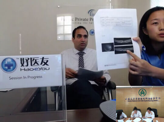 在我國(guó)50歲以上的人群中,大約每6個(gè)人就有1人患有年齡相關(guān)性黃斑變性(AMD),而且通常都是雙眼先后發(fā)病?,F(xiàn)年70歲的鄭大爺,如今也遭遇了這種眼病。一個(gè)月前,他發(fā)現(xiàn)自己視力變差了,看東西變形,于是就到當(dāng)?shù)蒯t(yī)院檢查,右眼OCT顯示黃斑區(qū)色素上皮脫離;眼底血管造影提示右眼黃斑區(qū)熒光滲漏,高熒光,醫(yī)生考慮是右眼老年性黃斑變性。后來(lái)通過(guò)好醫(yī)友中美遠(yuǎn)程會(huì)診平臺(tái),美國(guó)眼科醫(yī)生Peter J Joson, M.D.也對(duì)鄭大爺?shù)难鄣浊闆r進(jìn)行了遠(yuǎn)程評(píng)估。
