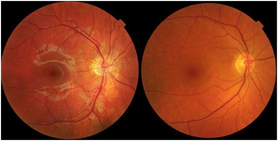 Joson博士解釋說(shuō):“患者OCT和熒光造影結(jié)果符合色素上皮層漿液性脫離,這常與黃斑變性相關(guān),也可能與中心性漿液性視網(wǎng)膜視網(wǎng)膜脈絡(luò)膜病變相關(guān)。鑒于患者年紀(jì)及左眼的玻璃體疣,我認(rèn)為他色素上皮脫離的主要原因應(yīng)該是黃斑變性。”