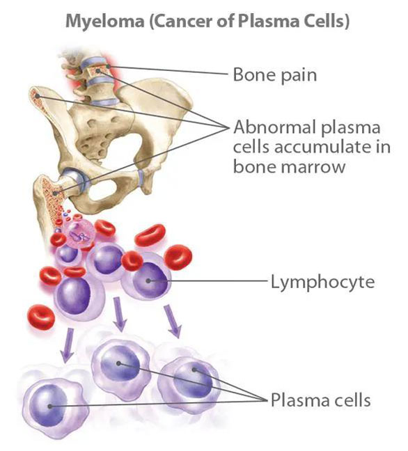 多發(fā)性骨髓瘤(MM)是僅次于非霍奇金淋巴瘤的第二大惡性血液腫瘤。其特征為骨髓漿細胞異常增生伴有單克隆免疫球蛋白或輕鏈(M蛋白)過度生成,常伴有多發(fā)性溶骨性損害、高鈣血癥、貧血、腎臟損害。由于正常免疫球蛋白的生成受抑,因此患者容易出現(xiàn)各種細菌性感染。