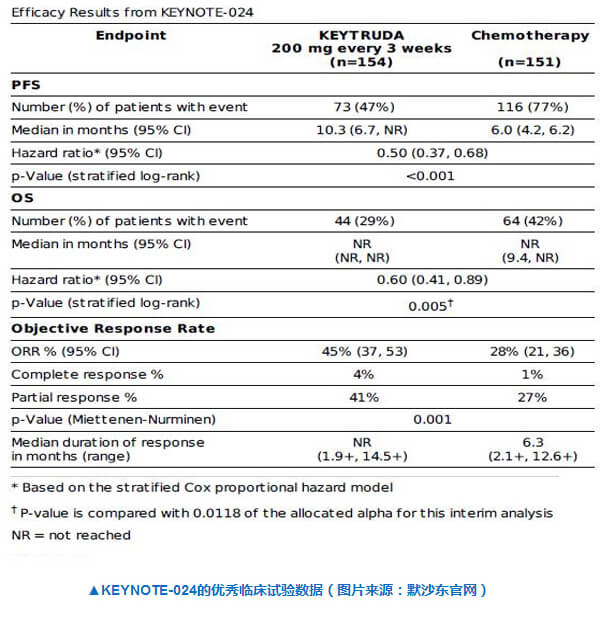 本次FDA批準(zhǔn)KEYTRUDA上市是基于KEYNOTE-024的優(yōu)秀臨床試驗(yàn)數(shù)據(jù)。在這項(xiàng)隨機(jī)、公開標(biāo)注的3期臨床試驗(yàn)中,研究人員檢驗(yàn)了KEYTRUDA作為單一療法治療非小細(xì)胞肺癌初治患者的療效,這些患者的PD-L1表達(dá)量都超過了50%。與標(biāo)準(zhǔn)的含鉑化療相比,使用KEYTRUDA的患者其無(wú)進(jìn)展生存期(HR, 0.50 [95% CI, 0.37, 0.68]; p<0.001)與總體生存率(HR, 0.60 [95% CI, 0.41, 0.89]; p=0.005)都得到了顯著的改善,分別抵達(dá)了主要與次要臨床終點(diǎn)。因此,這項(xiàng)試驗(yàn)也在今年6月提前終止,讓化療組的患者能夠第一時(shí)間接受KEYTRUDA的治療。