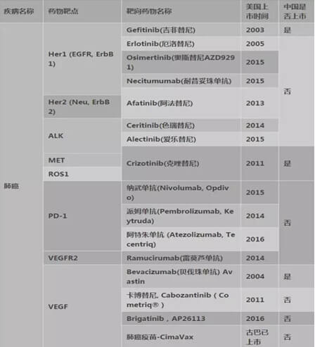 美國癌癥協(xié)會《2017癌癥年度統(tǒng)計報告》指出,美國癌癥死亡率從1991年的215.1(每10萬人)的峰值下降到2014年的161.2(每10萬人),其中,從1990年至2014年間男性肺癌死亡率下降43%,2002年至2014年間女性肺癌死亡率下降17%。這不僅與吸煙減少、早癌篩查普及相關(guān),更與美國肺癌的基因檢測、靶向藥物治療密不可分。(下圖示2017年之前在美獲批上市的肺癌靶向藥)